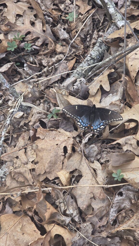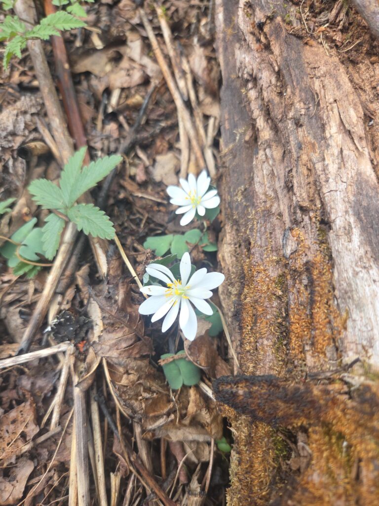 It was quite warm and sunny, with highs probably around 25°, and almost uncomfortably hot. But the views were beautiful and there were many small flowers popping up. I was able to identify round leaf violets, blue violets, Canadian lousewort, fan club moss, star chickweed, and downy rattlesnake plantain. I ate a few leaves of common plantain and a few blue violet blossoms for my daily dise if vitamin C.