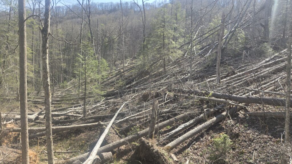 Overnight it was milder so I slept well. I hit the trail at 7:45. The first stop was High Rock which had some great views to the north and east. Then a long descent into Sam’s Gap, where a trail angel first got me interested in thru-hiking. Sure enough a trail angel, Nomad, was all set up, and five or six hikers were in comfy chairs in a circle eating, drinking and chatting. Nomad handed me a plate of pancakes with syrup. I devoured those, ate some cookies and a clementine and apple, and took a small baggie of dehydrated veggies and another containing two wraps, for later. Nomad hiked the trail a couple of years back and sets aside some money of his own for trail magic, and stops when the money runs out. I let my three one-dollar bills in his donation jar.