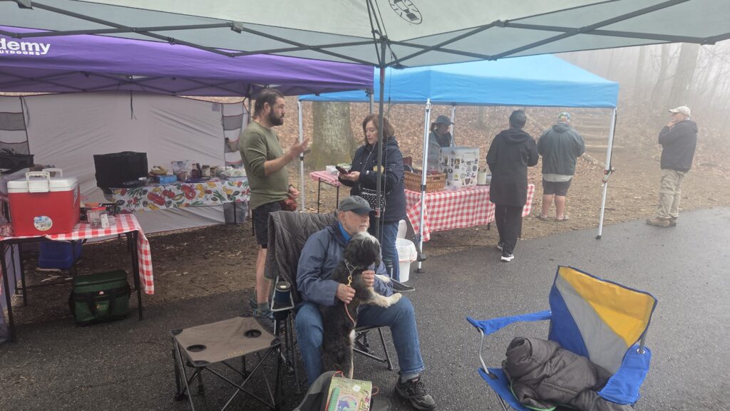 We had all agreed to wake up sometime around 7:00 a.m. John below me woke up first around quarter to 7:00 and that woke me up. I tried to cover my face with the arm of my fleece to stay asleep a little longer, but the fleece fell on the floor. A design flaw of the bunks in this place – things keep falling off the edges because there’s no border. It was nice to have hot coffee for a change – the previous two mornings I had just mixed cold water with instant coffee to save on gas. I managed to get out early around 8:00 a.m. but Chase had left probably 20 minutes before me. It was quite foggy out and a little rainy. I had my umbrella handy I tried to attach it to one of the holders on my backpack strap so that I could hike hands-free and keep my hands on the poles, but this really didn’t work. So I either head to hike without the umbrella in areas where it was too slippery or dangerous to hike with just one pole, or I had to hike with one pole and hold the umbrella with the other. In the end I just put the umbrella away because it really wasn’t raining very hard and I was drying off almost as soon as the raindrops fell on me. Unfortunately there wasn’t much in terms of a view because of the fog. Around 11:00 I came down to a gap which is a to say a road at a lower level and there were Trail Angels parked there there were three tents and they had a huge selection of food and drink. There was beef stew and when I asked about vegetarian they even had a vegetarian soup which they got out for me. They had tons of fruits and vegetables, they had granola bars, and all kinds of other things one might need on trail. I had a delicious bowl of soup, a banana, and some grapes. I took with me a clementine and an apple and a cylinder of electrolyte tablets. I continued on my way I passed probably four or five through hikers and quite a few day hikers since it is the weekend. Even though the weather was not great, people seem to be enjoying being out in it. By about 1:00 the rain had stopped and it stayed foggy for another 2 or 3 hours. I continued on past a shelter that was only 12 miles from my starting point, thinking I could make one that was 18 miles from my starting point by 5:00 p.m. however at 6:00 p.m. I was still not there. At 6:10 p.m. I found the Water Source near Blue Mountain shelter and filled up 3 l of water. Another 100 m up the trail was the shelter it’s a small shelter that probably only sleeps five and there were already three people in it so I decided to put up my tent. I cooked a meal of quinoa and black beans which I had made up at home and I have to say it was pretty gross. My tent unfortunately is not going up very well and it is raining now hopefully I will stay dry. I have to do a shorter day tomorrow so that I have an hour or two to practice putting up my tent so that I can figure out what I’m doing wrong. Had a brief call with Sheila in the evening but the connection was pretty poor so we weren’t able to chat very long. Overall a good day, but maybe 18 miles was a Touch Too Much might have been better to stick to 15 or 16. It’s 8:00