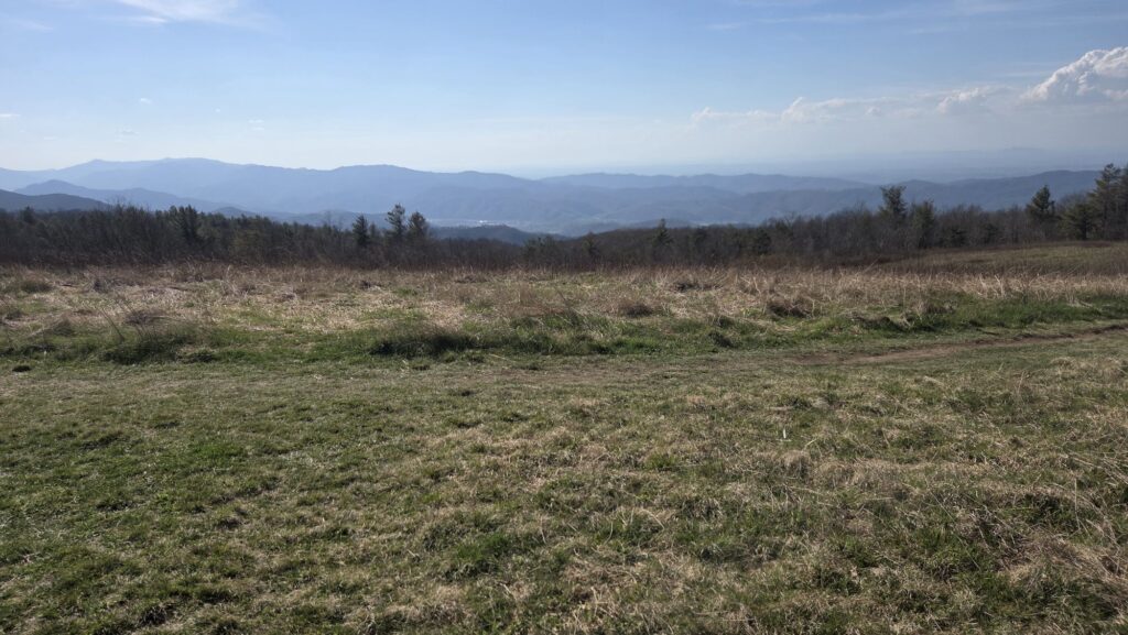 The trail climbed to Beauty Spot, a grassy bald with views on all sides. Another hour from there I reached the next water source, a gushing piped spring. I met a man my age whose trailname I’ve forgotten. He and several others were camped downhill from the spring, but the sites were very slanted and I didn’t want to try that again. After chatting and filling five liters of water I headed on uphill to an unofficial campsite purportedly containing some flat tent sites according to the FarOut app. Sadly no one else is camped here. I found a sloped site that is at least not as sloped as the ones by the spring. In spite of arriving at 6:30 I had dinner made, food hung, tent up, and all my bedding ready by 7:30.